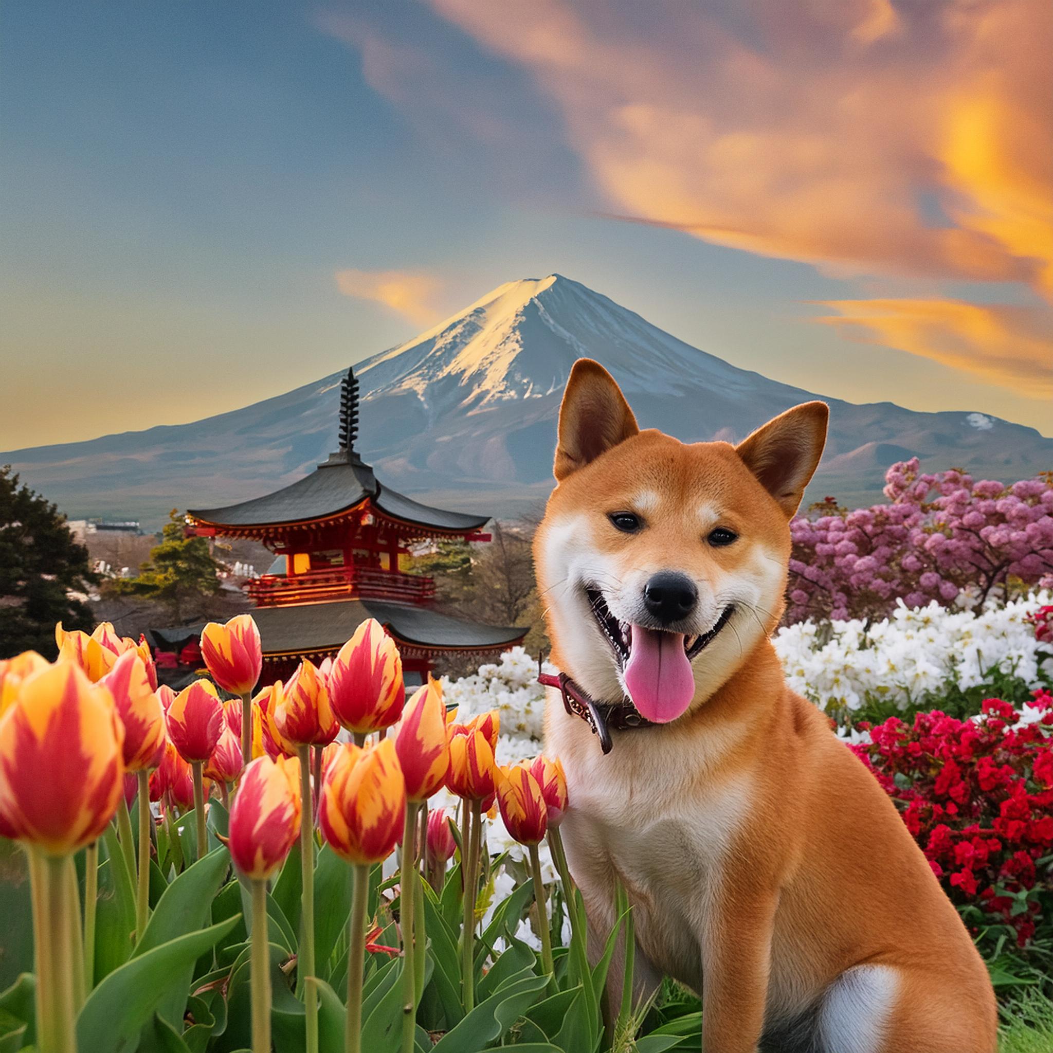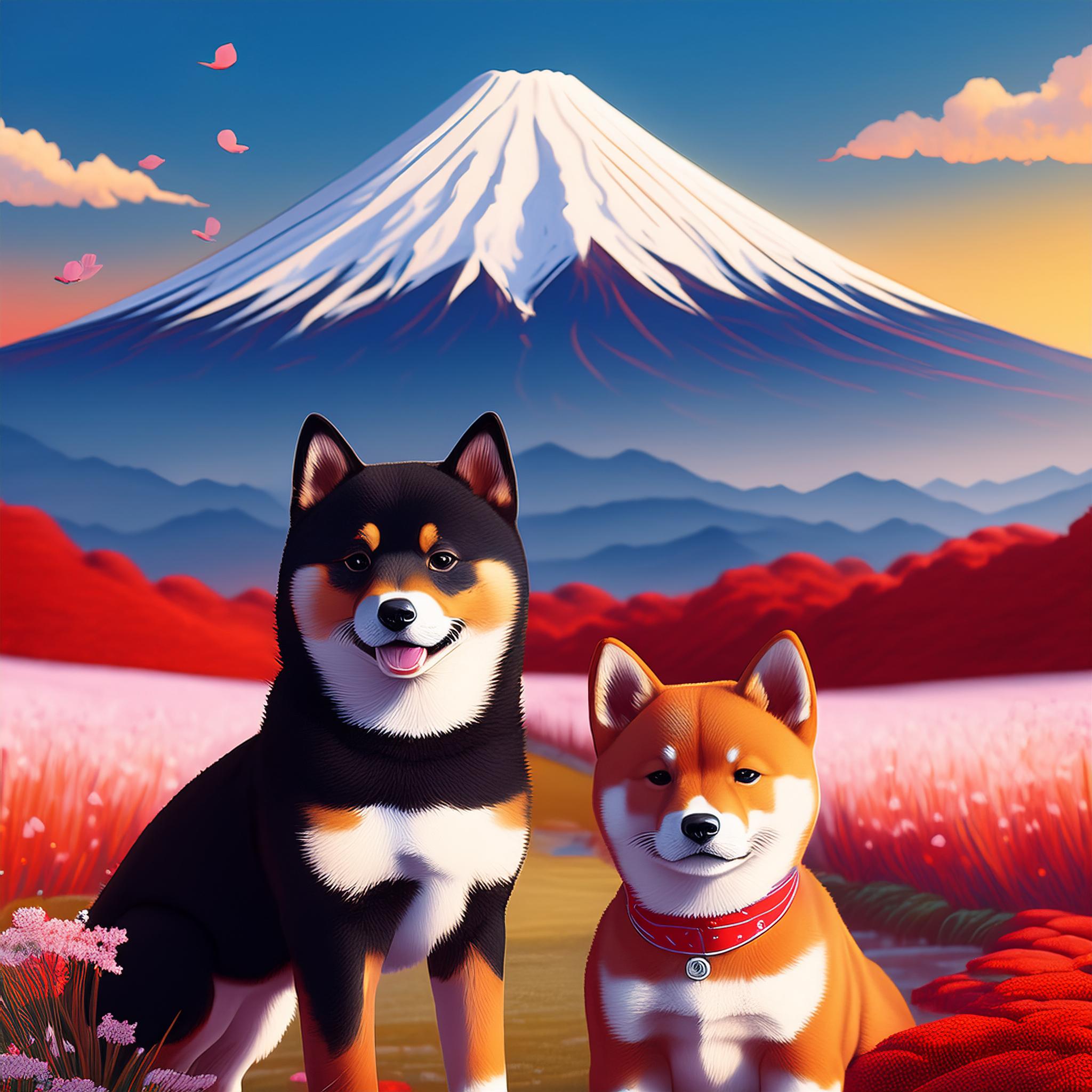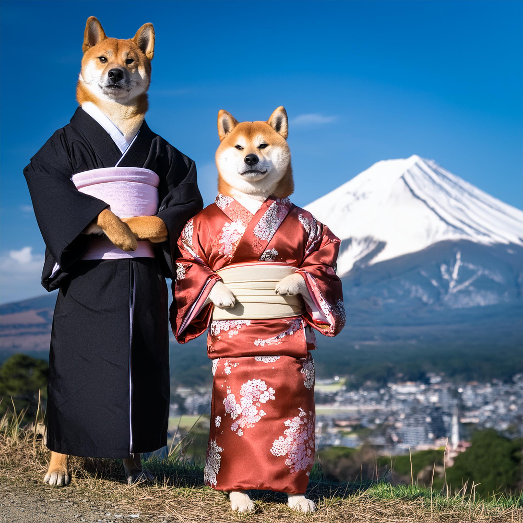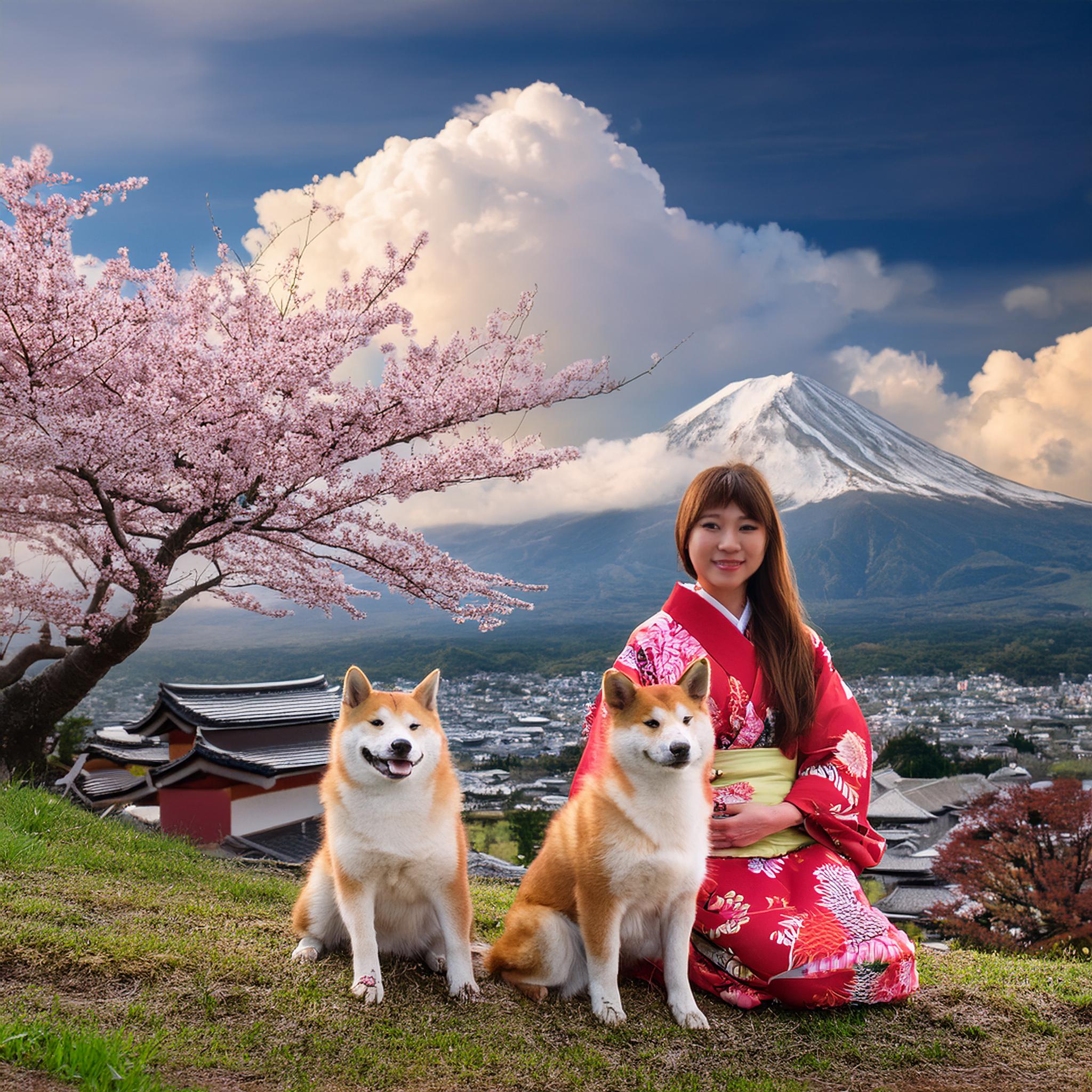 | Wir Shibas stammen urspünglich aus Japan. Dies ist ein Bild von meinem Grpßvater und Großmutter vor dem Berg ´Fuji´ dem höchsten Berg Japans |