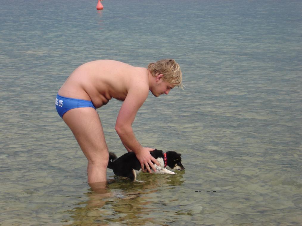 dabei. Schwimmen, Sand graben, mit Menschen schmusen, das ist ein tolles Hundeleben. |