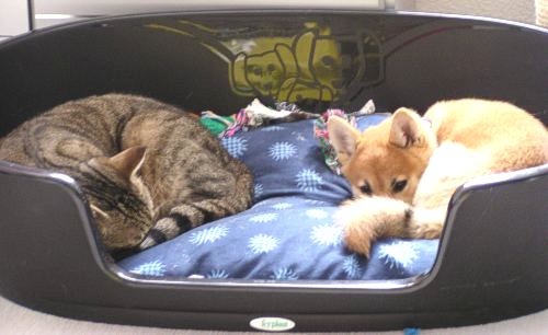 Es schlafen Hund und Katz in einem Bett, ist das Bild hier nicht sehr nett ? |