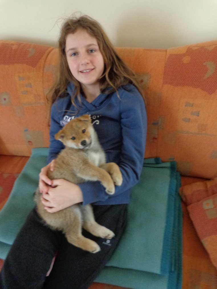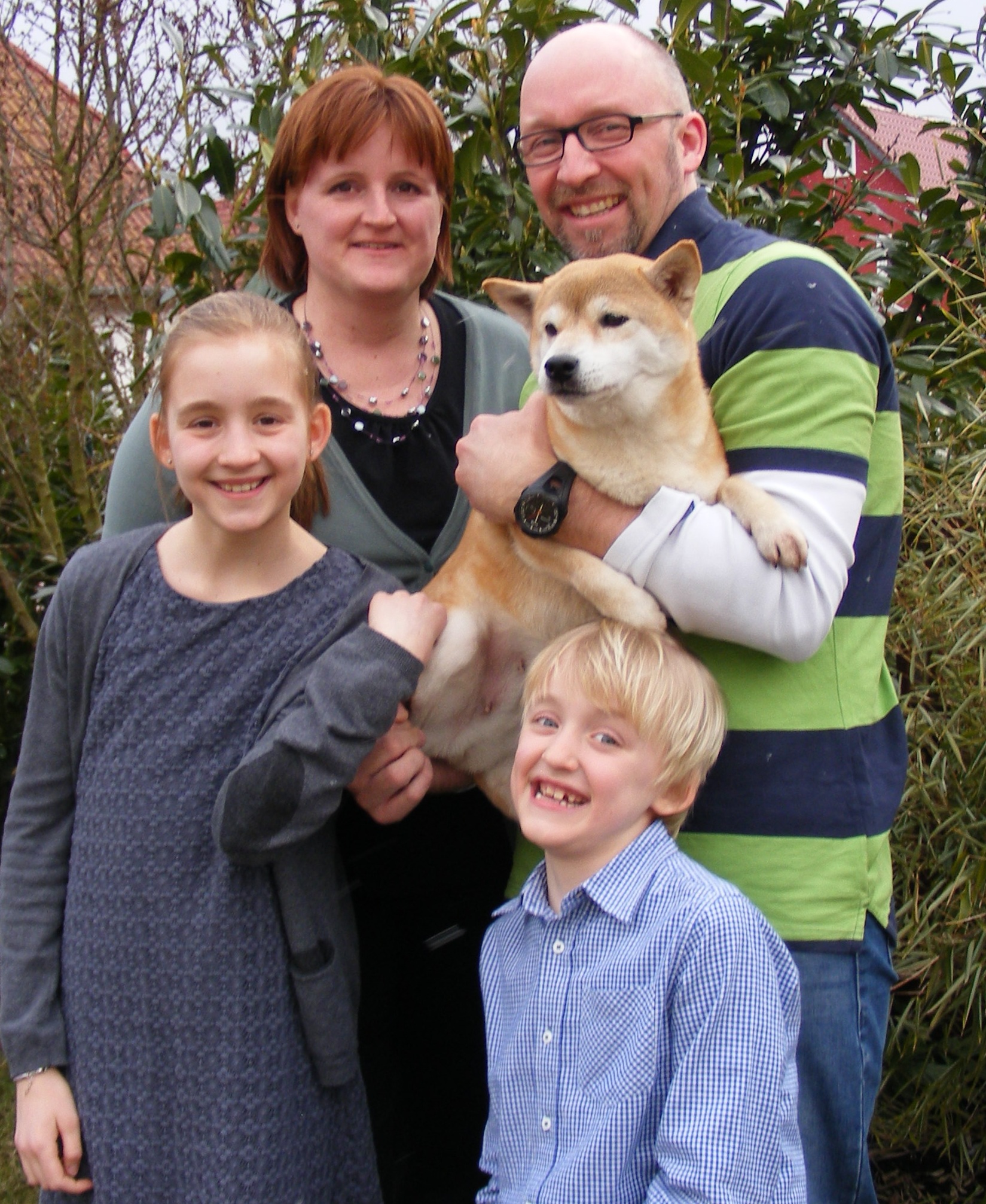 Ich bin ein treuer Shiba und hier mit meiner Familie. Hinten bin ich mit meinem Vater und meiner Mutter und vorne stehen meine menschlichen Geschwister. |