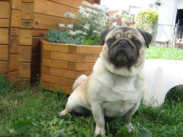 Ich bin ein lustiger Mops und mache auf der Menschen Knie gern hops. |